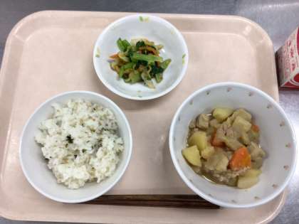 本日の献立 わかめごはん 牛乳 五目うま煮 野菜のおかかかけ