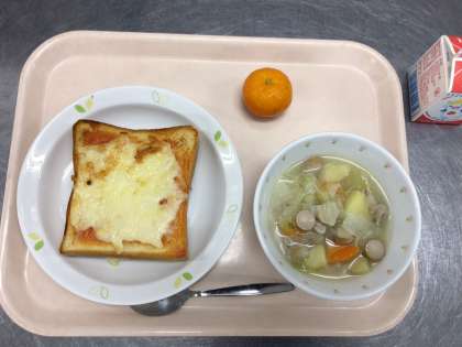 本日の献立 チーズトースト 牛乳 ポトフ 冷凍みかん