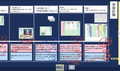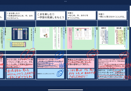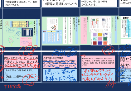 ICTを活用すると前の時間までの学習をすぐに見返すことができるため、「文様と同じで話題と問いと答えが書かれている。」「こまを楽しむでは、問いの文が2つ書かれている。」と2つの文章を比較して、共通点や相違点を見つけることができました。