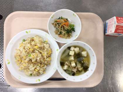 本日の献立 三色丼 牛乳 野菜のごまだれかけ 豆腐汁