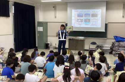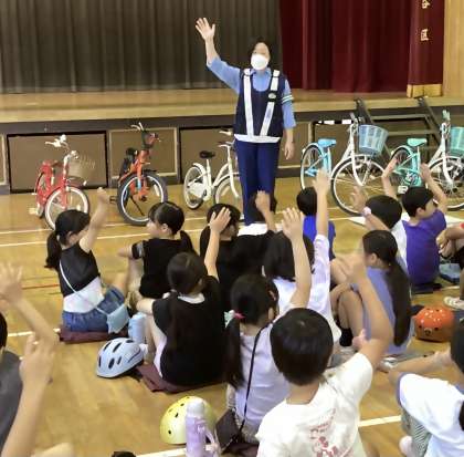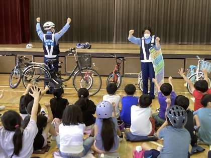 世田谷警察のおまわりさんと、正しい自転車の乗り方について学びました。「右見て、左見て、右斜め後ろを見て道路を渡る」方法を知らない子も多く、「これからは斜め後ろも気を付けて見るようにしたい」、と振り返っていました。自転車の準備や授業のお手伝いで、多くの保護者の方にご協力いただきました。ありがとうございました。