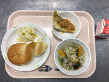 本日の献立 ミルクパン 牛乳 魚のエスカベージュ コーンポテト ベーコンと白菜のスープ