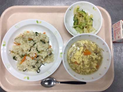本日の献立 青菜とじゃこのチャーハン 牛乳 卵入り中華スープ 中華サラダ