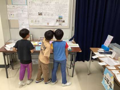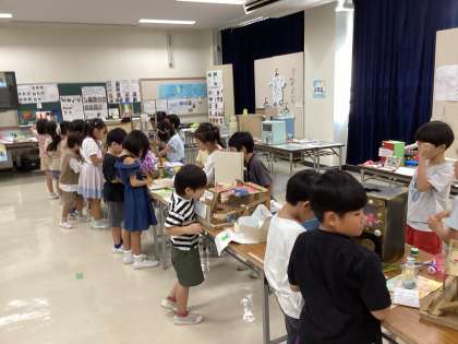 木曜日には、夏休みにつくった自由研究をクラスごとに鑑賞しました。他の学年の作品を見て「すごい!」と言っていたり、楽しそうに遊んだりしていました。