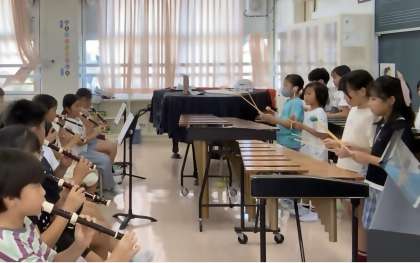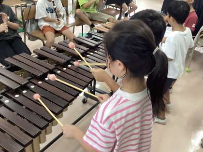 3年生では、1学期に学習したリコーダー、歌に加えて、木琴を使い、合奏をしました。