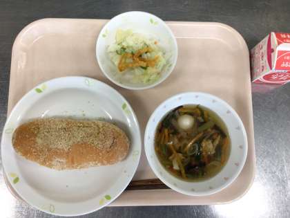 本日の献立 あげパン(白ごま) 牛乳 春雨スープ パリパリサラダ