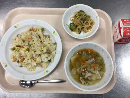 本日の献立 チャーハン 牛乳 もやしのコチュジャンかけ ワンタンスープ