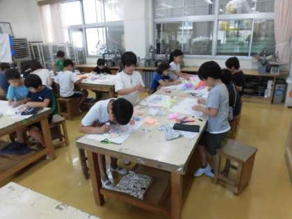 最後にボタンやモールで飾り、色画用紙に貼り、にぎやかな作品ができました。