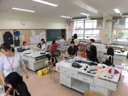ミシンやアイロンなどを高学年が教えたりなど、交流をしています。