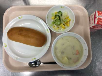 本日の献立 ミルクパン 牛乳 クリームシチュー コーン入りフレンチサラダ