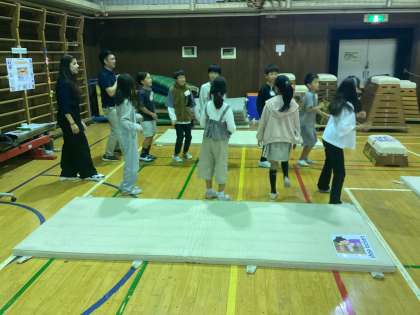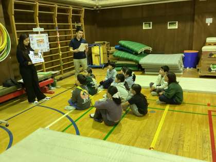 道案内のブースでは、「go straight」「turn around」「turn left」「turn right」の4つのフレーズを使い、目的地までたどり着く活動を行いました。