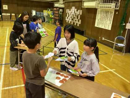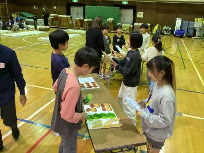グローサリーストアのブースでは、スーパーで欲しいものを伝えたり、店員として接客をしたりする際に使う英語を練習しました。「How many ~」や「What do you want」などのフレーズを使って買い物体験をしました。