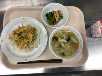 本日の献立 かきあげ丼 牛乳 みそ汁 おひたし