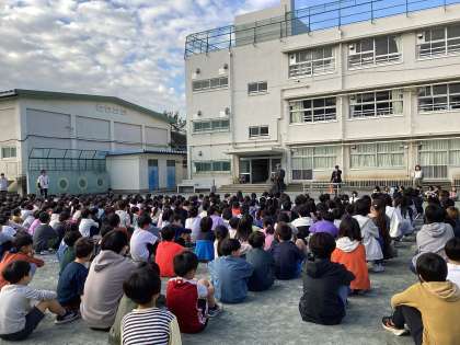気持ちのよい秋晴れの中、全校朝会が行われました。