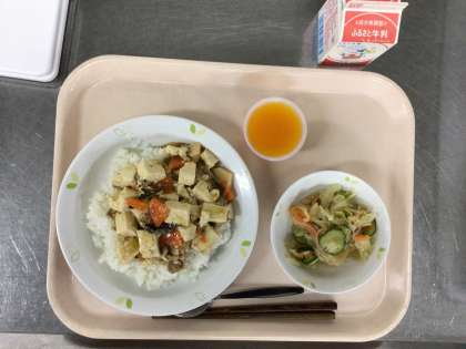 本日の献立 家常豆腐丼 牛乳 春雨サラダ キャロットゼリー