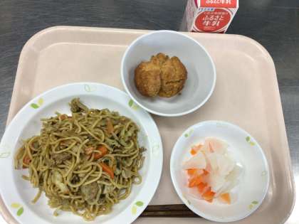 本日の献立 ソース焼そば 牛乳 大根の甘酢かけ ごま入りドーナッツ