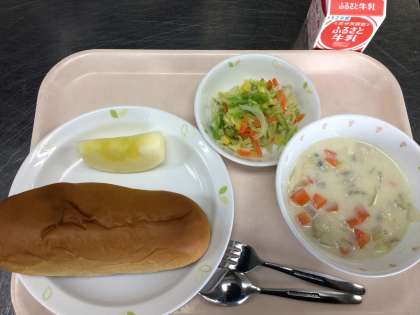 本日の献立 黒砂糖パン 牛乳 クラムチャウダー コーンサラダ りんご