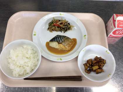 本日の献立 ごはん 牛乳 魚のピリ辛ソースかけ 大根とひじきのおかかあえ お豆かりんとう