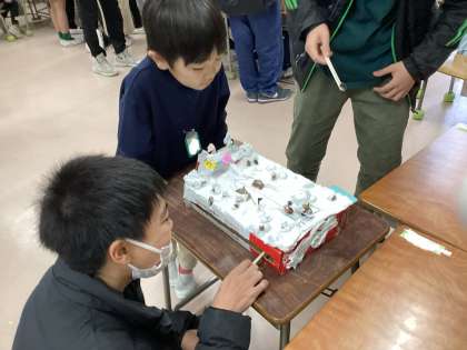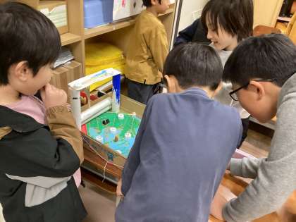 生活科では、子どもの広場公園で拾ったどんぐりを使っておもちゃ作りをしました。今日は、大好きな6年生を招待し、作ったおもちゃで遊んでもらいました。1年生のルール説明を真剣に聞き、全力で楽しんでくれる6年生の姿に1年生も嬉しそうでした。