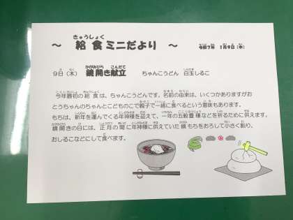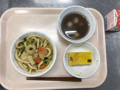 本日の献立 〜鏡開き献立〜 ちゃんこうどん 牛乳 卵焼き 白玉しるこ