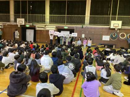 全校の前で2年生のあいさつスローガン「明るく・にこにこ・すてきな あいさつ」について、発表しました。挨拶をして相手も自分も気持ちの良い学校生活を送れるようにしていきます。