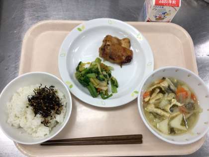 本日の献立 ごはん 牛乳 ひじきのふりかけ 鶏肉の南蛮焼き おひたし みそ汁
