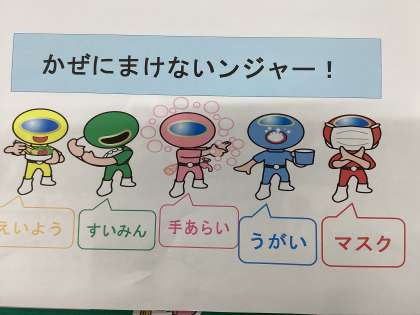 今日、身体計測を行いました。一人一人健康カードをもらうと、身長が伸びたことに喜んでいる様子が見られました。心も体も着実に成長しています。また、保健室の保科先生からは、「かぜにまけないンジャー」を教えて頂きました。この5つを守りながら、健康に元気に過ごしていきたいと思います。