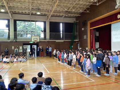 2年生がお手本となり、全校で歌を歌いました。自分たちで掛け声や動作を考え、楽しく歌うことができました。これからも元気な笑顔で歌を歌っていきたいですね。