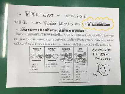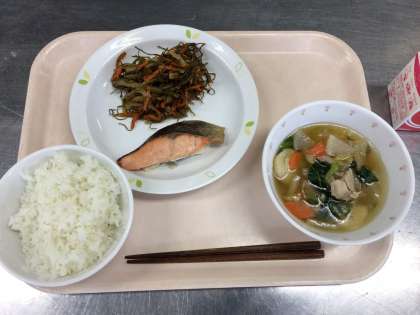 本日の献立 〜給食記念日献立〜 ごはん 牛乳 魚の塩焼き 五目きんぴら すいとん