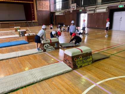 1年生は、体育で「とびばこあそび」「ボール投げゲーム」を行っています。