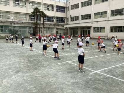 ボール投げゲームでは、2クラス合同ではしごドッジボールを行っています。片手で投げる、両手でしっかりキャッチをするということを意識して、子供たちは一生懸命活動しています。
