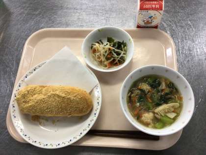 本日の献立 あげパン(きな粉) 牛乳 肉だんご入り春雨スープ 和風サラダ