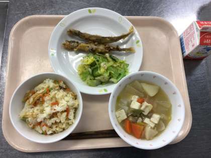 本日の献立 子ぎつねごはん 牛乳 天ぷら(ししゃも) 野菜のゆかりかけ 豚汁