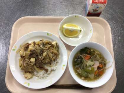 本日の献立 牛丼 牛乳 ワンタンスープ はるか