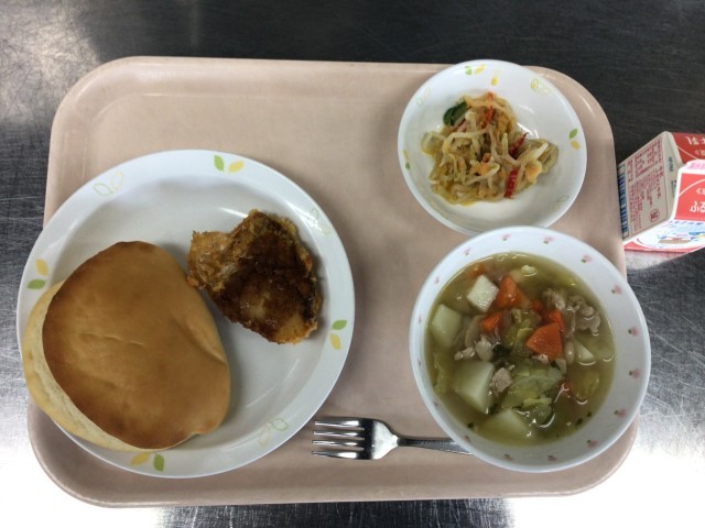 本日の献立 セルフフィッシュサンド 牛乳 白いんげんの田舎風スープ にんじんドレッシングサラダ