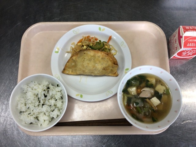 本日の給食 わかめごはん 牛乳 ジャンボぎょうざ もやしのコチュジャンかけ 中華スープ