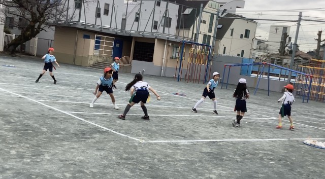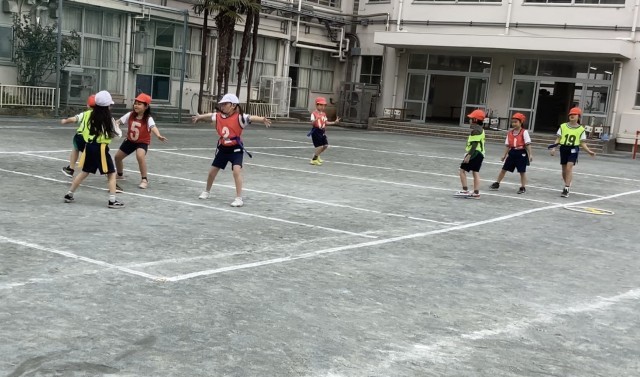 校庭でボール運びゲームをしました。楽しくするためにルールを工夫したり、勝つためにチームごとに作戦を立てたりと考えながら学習しました。ゲームの中でも子供たちから、「ナイス」や「惜しかったよ」など互いに頑張っている姿を称賛する声が聞こえてきました。勝ち負けを受け入れる気持ちも育っていってほしいです。