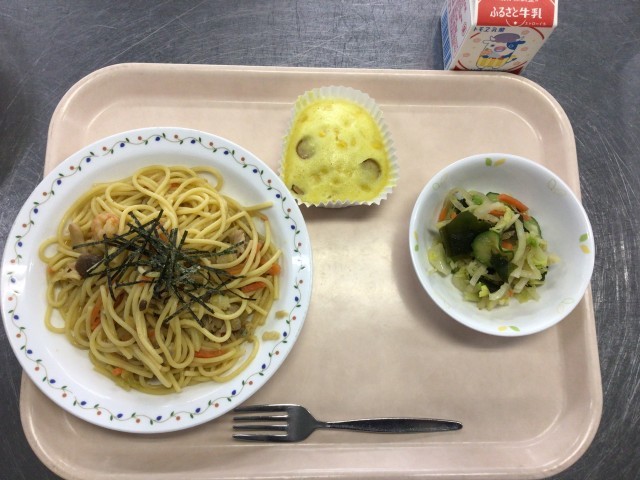本日の献立 和風スパゲッティ 牛乳 わかめサラダ ウィンナーとコーンの蒸しパン