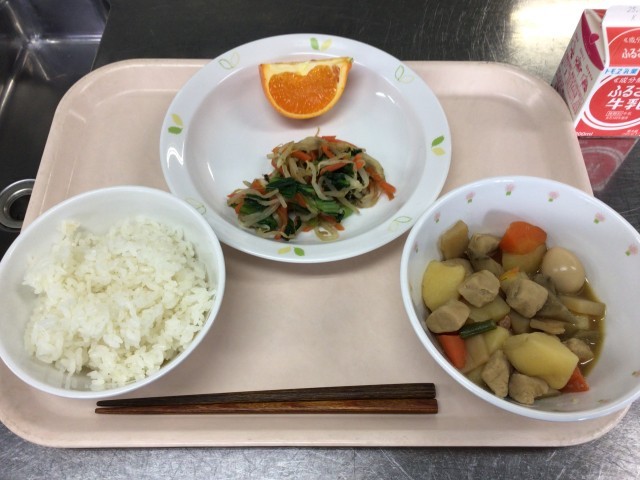 本日の献立 ごはん 牛乳 鶏肉とじゃがいものうま煮 青菜ののりあえ せとか