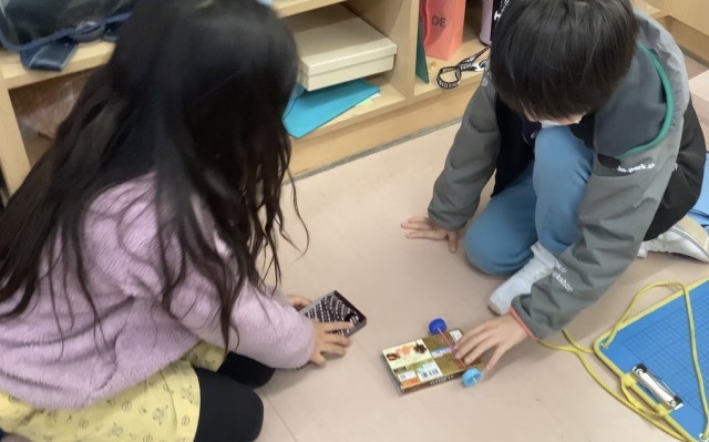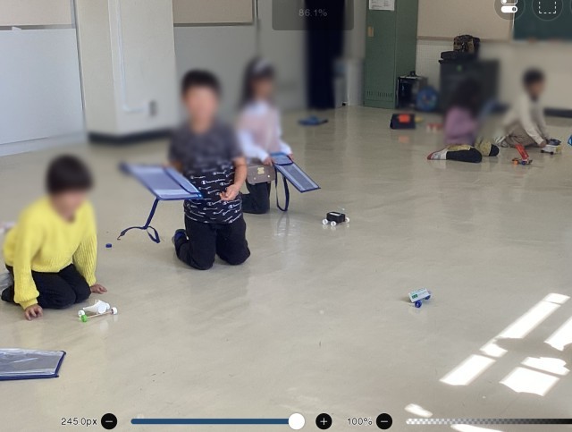 風で動くおもちゃを開発しています。どうやったら遠くに進むか考えて作り直し、また考えて作り直し・・・。時には友だちとアドバイスし合いながらおもちゃを進化させました。