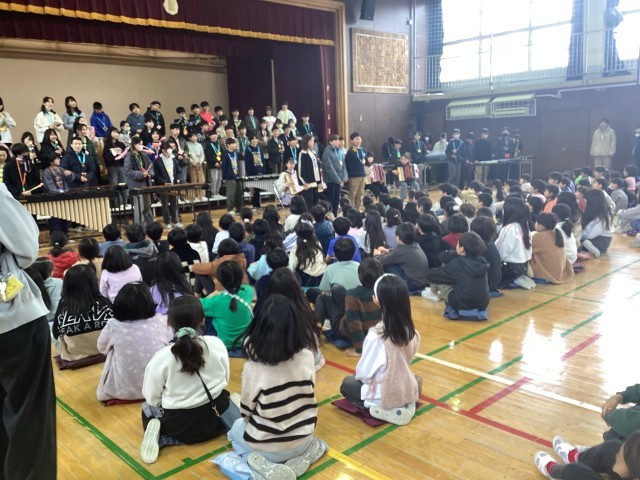 6年生を送るおもてなし会の終了後、体育館に集まりました。たくさんのあたたかいおもてなしへのお返しに、6年生から演奏のプレゼントをしてくれました。