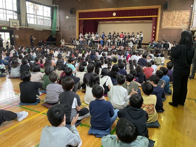 テンポのいい楽曲で、自然に手拍子が生まれ6年生の演奏に驚いていました。6年生もみんなからの手拍子に嬉しい気持ちになり、さらに演奏がにぎやかになりました。