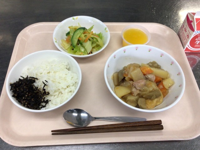 本日の献立 ごはん 牛乳 ひじきとおかかのふりかけ 筑前煮 野菜の塩こんぶかけ フルーツゼリー