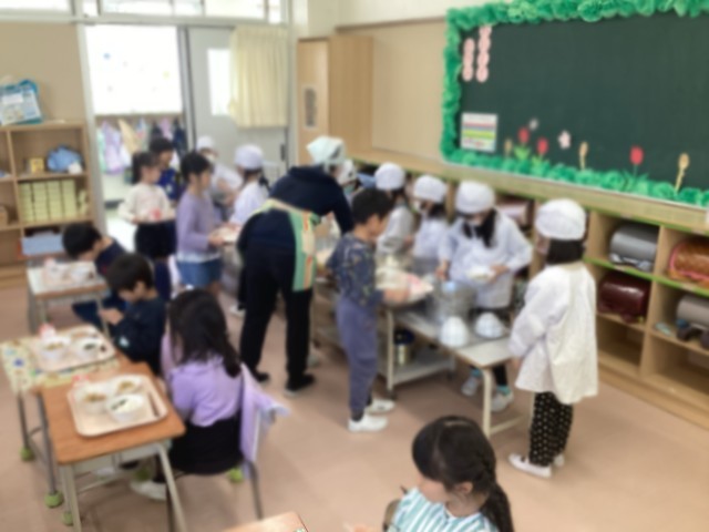 給食では、当番を中心に配膳を行い、しゃべらずに待つということにもとても頑張っています。食べている時も自分の好きなものはもちろんのこと、苦手なものにも挑戦しようと頑張っています。「おいしい!」という声もたくさん聞こえてきました。