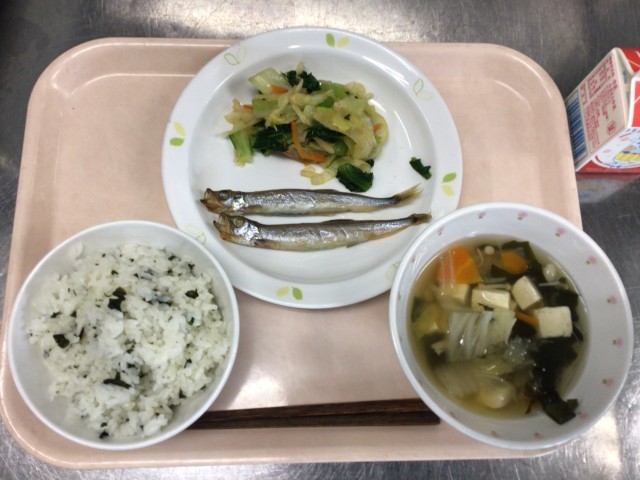 本日の献立 わかめごはん 牛乳 焼きししゃも 豆腐汁 野菜のおかかかけ