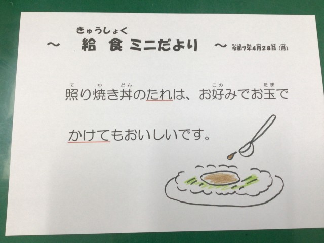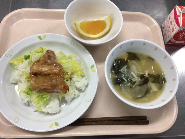 本日の献立 鶏肉の照り焼き丼 牛乳 みそ汁 河内晩柑