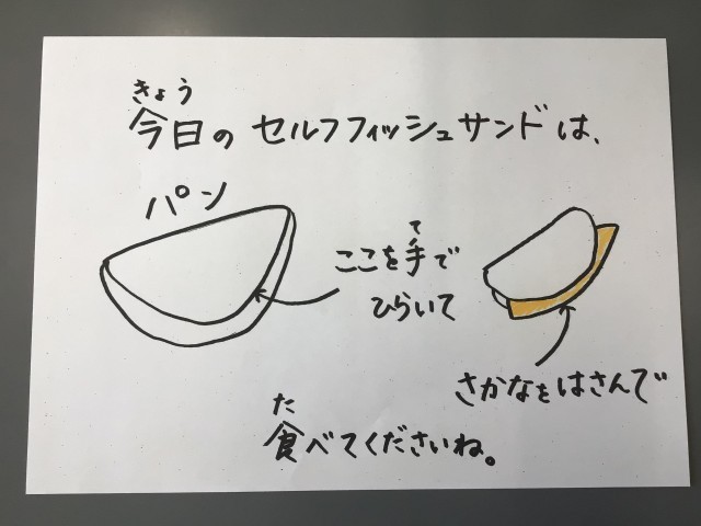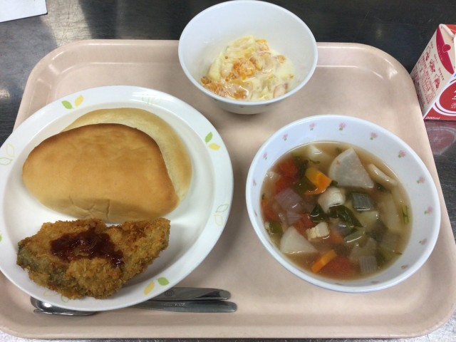 本日の給食 セルフフィッシュサンド 牛乳 レンズ豆入りミネストローネ フルーツヨーグルト