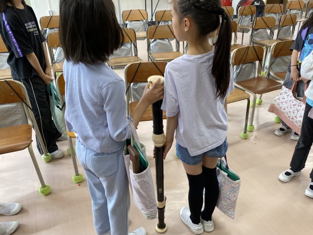 リコーダーの種類は様々あり、自分たちが演奏しているソプラノリコーダーより小さいものや大きいものもあります。その中のバスリコーダーの音色を実際に聴いて、低く響く音を楽しみました。最後は「リコーダーと背比べしたい!」という子が集まり、リコーダーと並んで大きさを比べました。