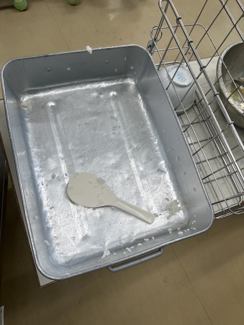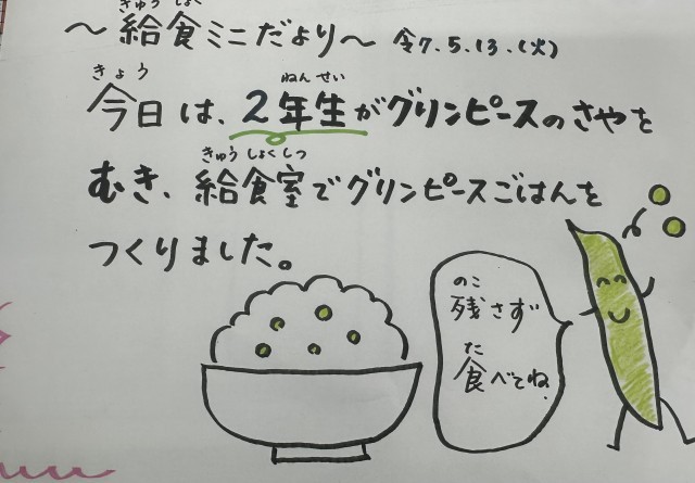 今日の給食は、2年生が一生懸命、さやむきをしてくれたグリンピースの入ったご飯が出ました。