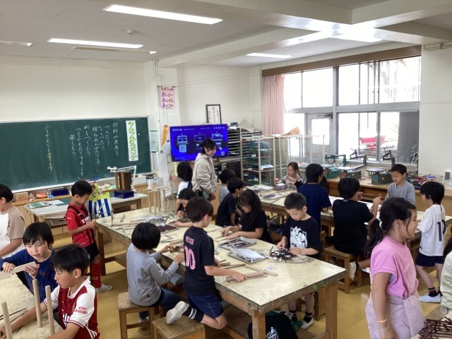 図工室にある用具を積んだり、並べたり、組み合わせたりして、形をつくっていく造形あそびを行いました。